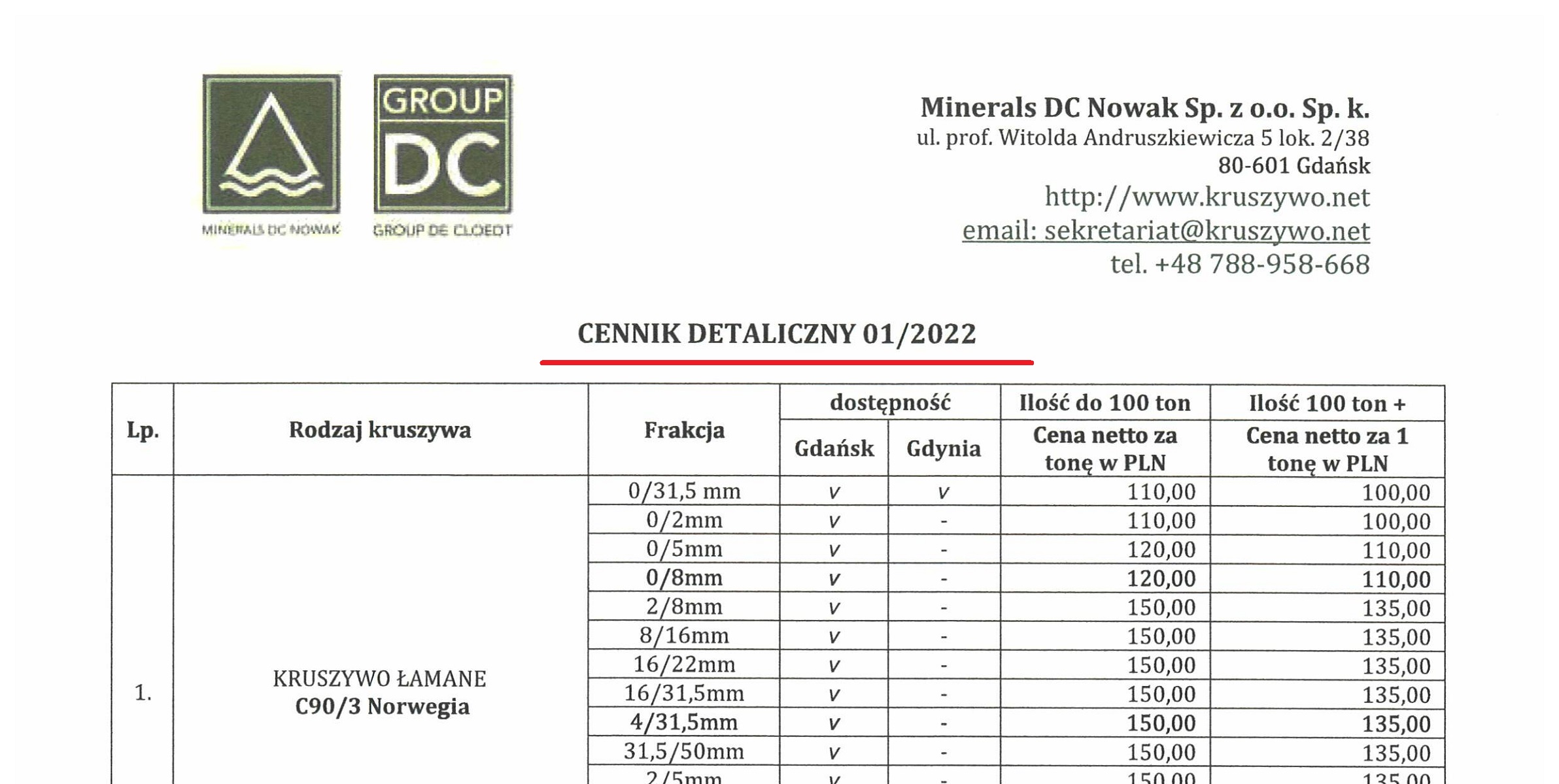 Cennik nie obejmuje całego oferowanego asortymentu, lecz wyłącznie dotyczy frakcji kruszyw najczęściej kupowanych w ostatnich latach i zwyczajowo dostępnych „od ręki”.